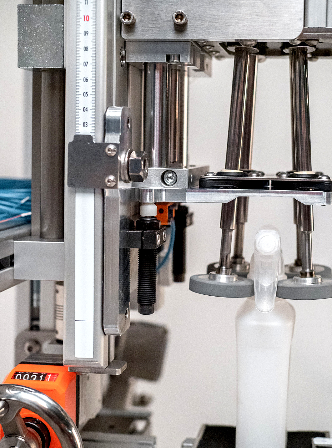 Pump spray bottle being handled by friction wheels, detail of our miniature shock absorbers for higher cycle rates and perfect end position protection to the left