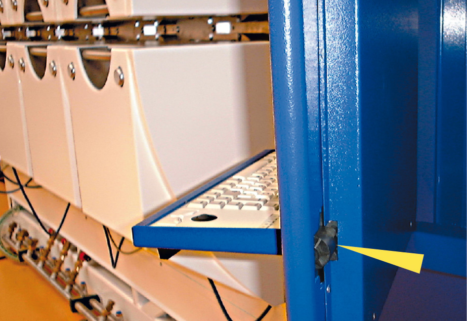 ACE rotary dampers protect the keyboard. To provide long term protection in arduous and often dirty industrial applications (and also to protect against unauthorised access) the machine keyboard is installed in a lockable and pivoted housing cabinet. ACE rotary dampers model FRN-F1 were installed on the pivot axis to provide a smooth controlled motion to the keyboard as it is pulled down into its operating position. The damper also prevents overloading the hinge system and prevents damage to the keyboard, the housing cabinet and the hinges.